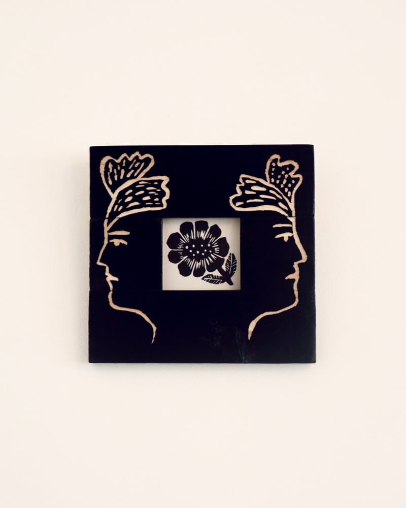 Miniature linocut print inside a handmade frame protected by hand-cut acrylic sheet. Ready to hang.